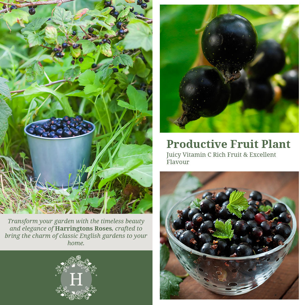 BLACKCURRANT BEN NEVIS: Very heavy crops of large shiny black berries ripening in bunches from mid-summer. Produces a densely branched upright bush and tasty fruit excellent for summer pies, fruity jams and ideal for home freezing.