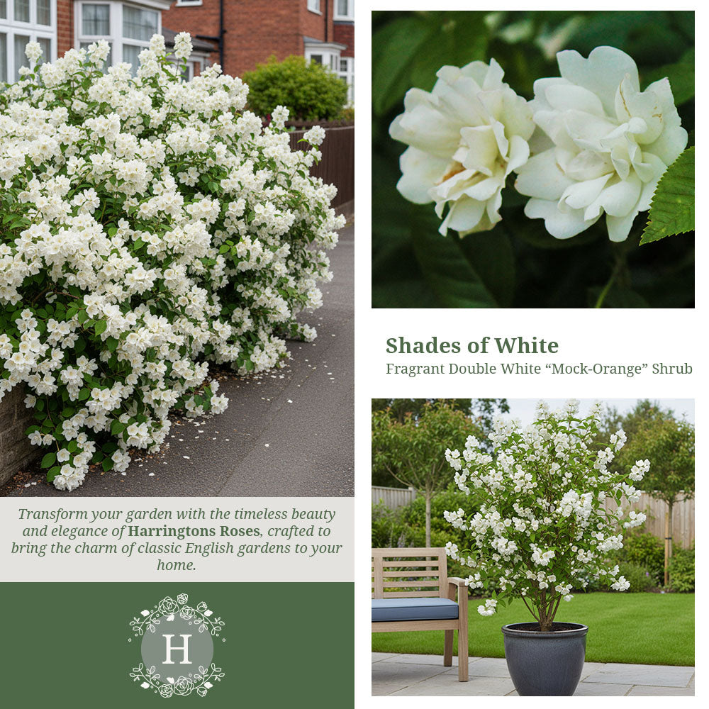 PHILADELPHUS VIRGINAL: A classic amongst Summer-flowering shrubs. The large double, white, scented flowers are produced in mid-summer in profusion and contrast very well with the large. mid-green leaves, which turn yellow before falling in Autumn. Plant as a specimen or en-masse. Ideal for the back of mixed or shrub borders.