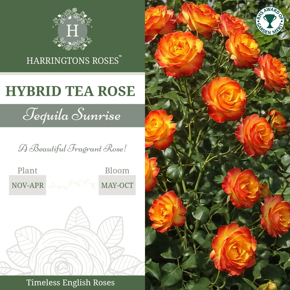 TEQUILA SUNRISE: Bring the drama of dawn to your garden with Rosa ‘Tequila Sunrise’ — a striking hybrid tea rose whose blooms unfold in rich golden yellow, edged in vibrant scarlet red. Each petal glows as if kissed by the morning sun, creating a fiery two-tone display that changes with the light. It’s a rose that instantly draws the eye and becomes a conversation piece in any garden.