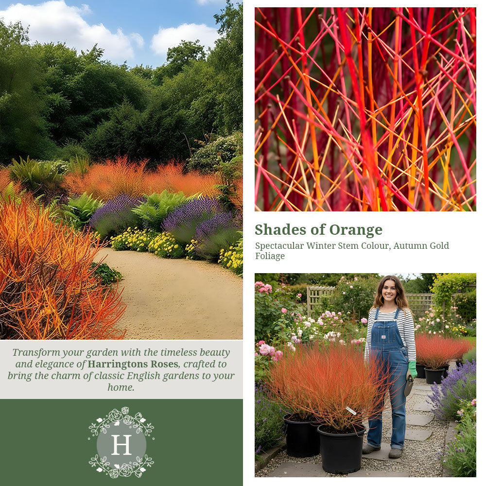 SANGUINEA MIDWINTER FIRE: A compact and hardy deciduous shrub producing a brilliant supply of bright orange, yellow and red stems during the Winter months.