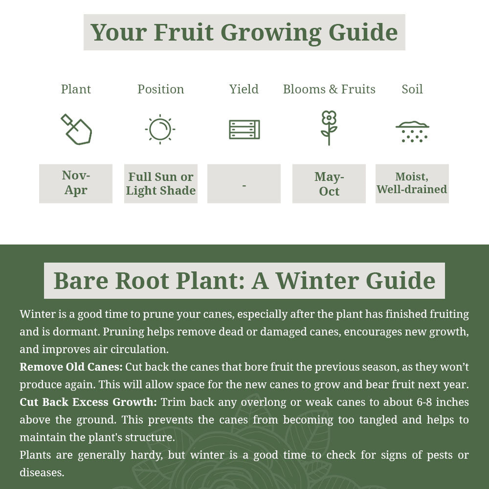 CARE: Fruit is produced on previous year's shoots. Tie in new shoots - these will flower and fruit in the second year. Cut away all fruiting canes after harvest and replace them with new vigorous shoots and the most vigorous of the older ones. Cut back weak and damaged shoots in Autumn. In Spring apply a general fertiliser.