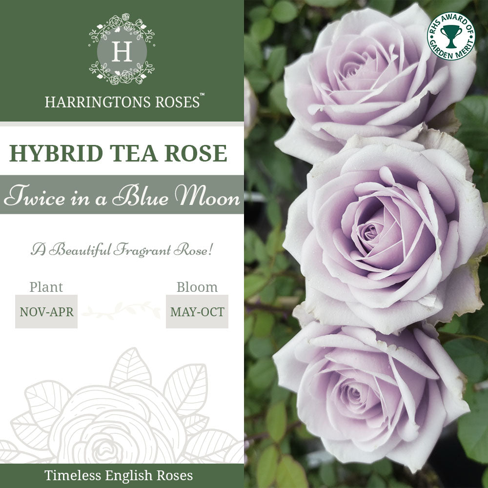 TWICE IN A BLUE MOON: Rosa ‘Twice in a Blue Moon’ features elegant, lilac-lavender roses with beautifully formed petals and a refined, classic shape. Its dreamy colour adds something truly special to any garden — soft, serene, and naturally eye-catching.